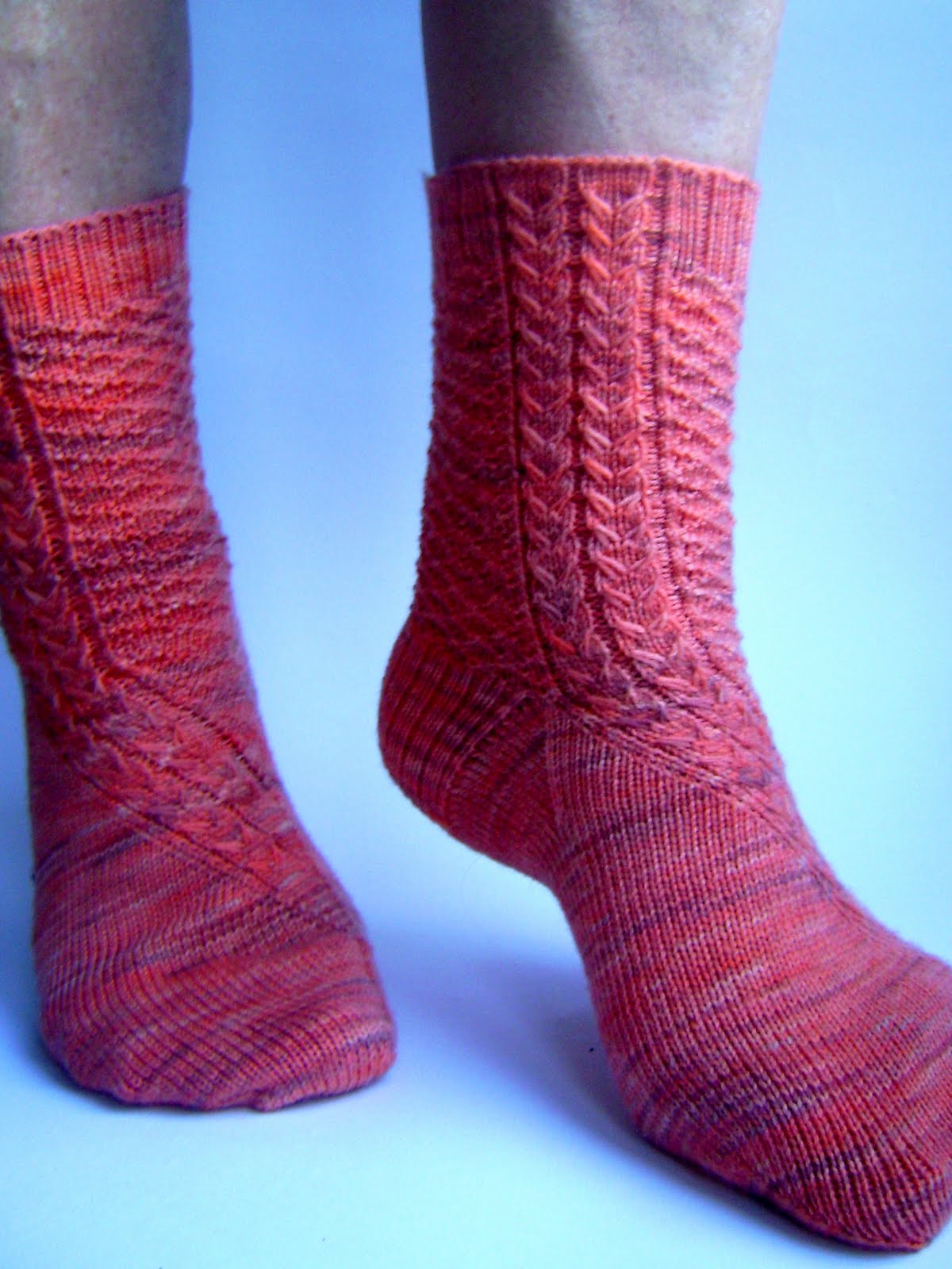 These socks are inspired by the truck Charlie gives to Bella on her return to Forks. The truck is old and does not go fast, but it is reliable (unless Edward is trying to prevent Bella from going somewhere) and it becomes almost like a friend throughout the first three books, constant and comforting, until it is replaced by Edward at the beginning of the fourth. The truck was once red but over the decades it has faded, in some places more than others. The socks have tyre tracks running from the cuff, down the leg and across the foot. Around the rest of the leg is a diamond pattern inspired by the snow chains Charlie fits to the truck.